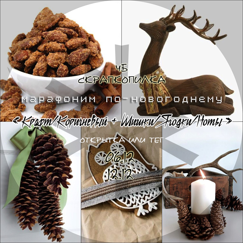 Зачем же я все это пишу сейчас? А потому что последний 6 этап марафона "Марафоним по-новогоднему" в Скрапкопилке Крафт/Коричневый + Шишки/Ягодки/Ноты. И у меня, ну совершенно случайно), даже оказалась в запасах коричневая бумага и коричневая лента).